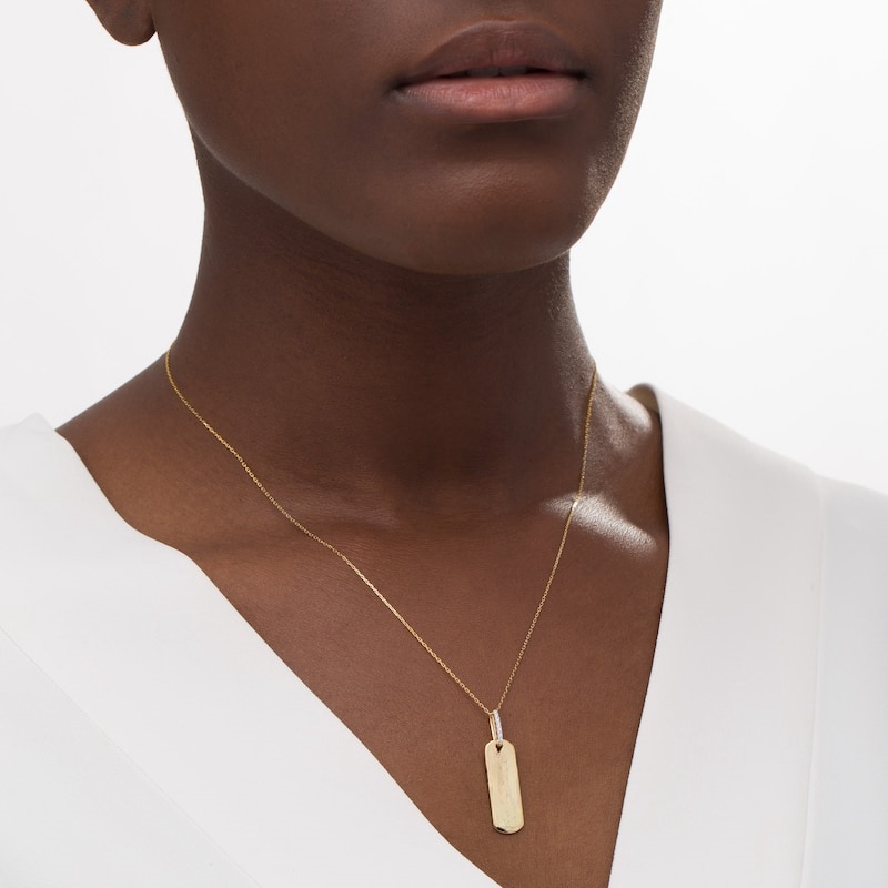 Crafted in warm 10K gold, this petite tag features the word "Believe" inscribed vertically along the center. Diamonds line the bail for a hint of sparkle. Captivating with 1/20 ct. t.w. of diamonds and a bright polished shine, this pendant suspends along a 16.0-inch cable chain with 2.0-inch extender that secures with a spring-ring clasp.This exclusive fine jewelry collection inspires you to wear your strength, confidence and power.