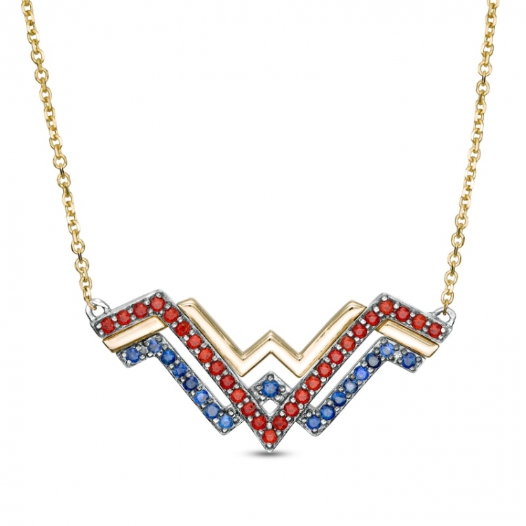 With stunning color, this distinctive gemstone necklace from delivers valiant design. Fashioned in sterling silver and warm 10K gold, this dynamic choice showcases the "WW" logo in eye-catching silver rows of regal red garnets and bright blue sapphires. A sculpted ribbon in polished yellow gold completes this classic symbol. Buffed to a brilliant luster, this look suspends centered along an 18.0-inch cable chain that secures with a spring-ring clasp. This exclusive fine jewelry collection inspires you to wear your strength, confidence and power.
